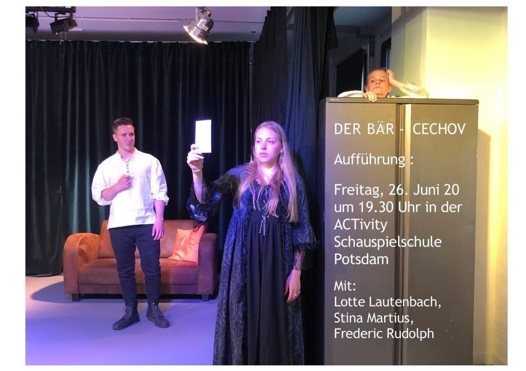Ein Stuhl zerbricht. Eigentlich kein großes Unglück, doch hier das allergrößte! Es war doch der Lieblingsstuhl des geliebten Gatten. Verzweifelt wird versucht ihn zu reparieren und das gelingt auch notdürftig. Aber dann treten andere Unannehmlichkeiten auf die Bühne in Form eines unangemeldeten Gastes, der auch noch Geld will! Ein kurzweiliger Einakter von Anton Cechov, der 120 Jahre nach seiner Berliner Premiere auf Deutsch, von der Donnerstagsgruppe der ACTivity Schauspielschule auf die Bühne in der Hegelallee gebracht wird. Kommt vorbei am Freitag, den 26. Juni 2020 um 19’30 Uhr, Dauer etwa 35 Minuten, kein Nacheinlass möglich!